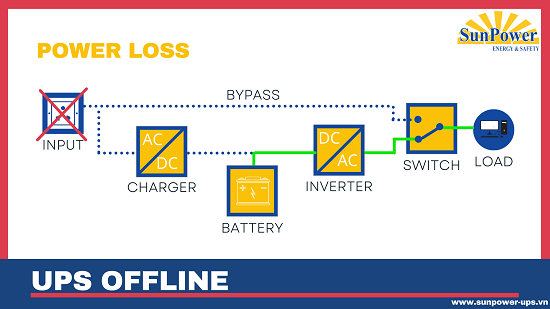 •Trường hợp điện lưới không ổn định hoặc mất điện: thì UPS Offline sẽ tự động chuyển mạch, dùng nguồn dự phòng từ ắc quy cấp cho khối Inverter, Inverter sẽ tiếp tục biến điện áp một chiều thành điện áp xoay chiều có đầu ra phù hợp với thiết bị để duy trì hoạt động.